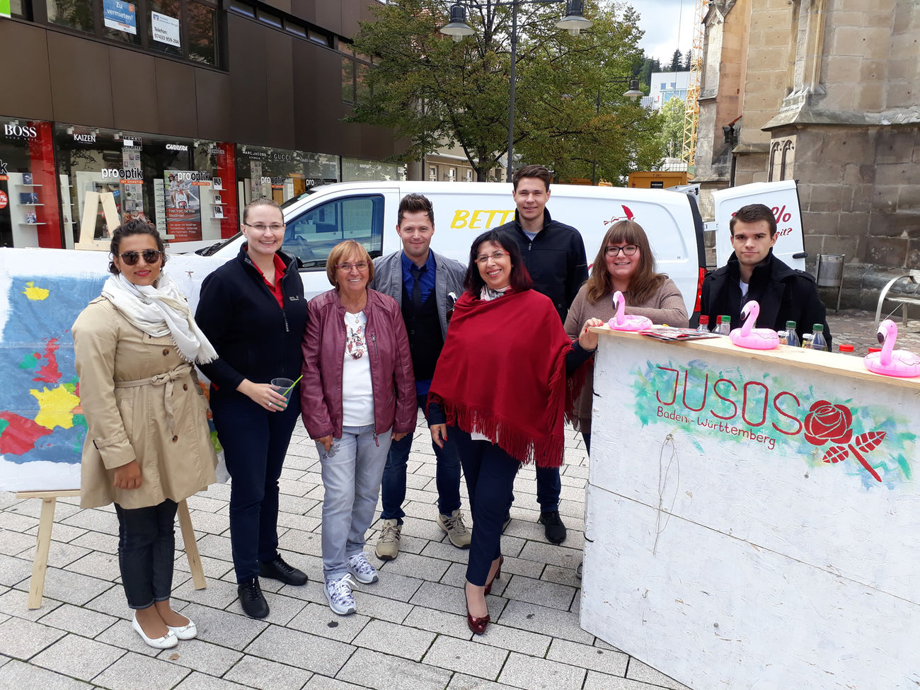 „Better call Schulz“ prangt mit großen Lettern auf dem Wahlkampf-Bus der Jungen Sozialdemokraten (Jusos) Baden-Württemberg, der am vergangenen Sonntag in Balingen einen Halt einlegte. Rund um den Bus waren einige Aktionen aufgebaut, so zum Beispiel eine Europa-Dartscheibe und ein Wurfspiel, das unter dem Motto „Schlechte Arbeitsbedingungen wegwerfen“ stand. Wenn Passanten ein Spiel für sich entscheiden konnten, wurden sie an der Juso-Cocktailbar mit einem leckeren Getränk belohnt.