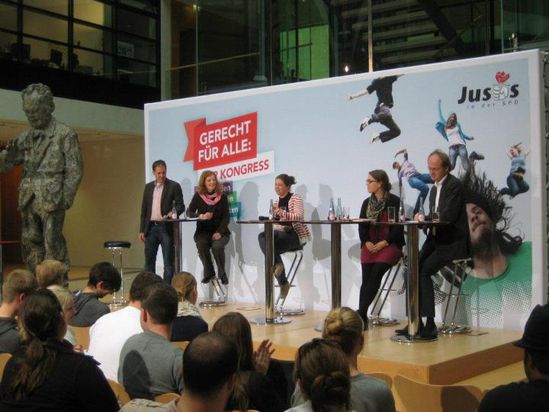 Auf Einladung des Juso- Bundesverbands trafen sich dieses Wochenende (18. - 20. Mai 2012) in Berlin Jusos aus ganz Deutschland. Auch mehrere Jusos aus dem Zollernalbkreis nahmen am sogenannten „Linkskongress 2012“ teil. Die Teilnehmerinnen und Teilnehmer der Jugendorganisation der SPD diskutierten über das aktuell brennende Thema der Euro- Krise und über die fehlerhafte Krisenpolitik der Bundesregierung. Die Notwendigkeit neben dem jetzigen Fiskalpakt einen Wachstumspakt für die krisengeschüttelten Euroländer zu schnüren wurde mehrheitlich von den Anwesenden gefordert. Von den Jusos Zollernalb wurde dies ebenfalls unterstützt. Die Eurokrise wurde von den Jusos vor Ort bereits auf einer Kreissitzung im April in Balingen diskutiert und ein Wachstumspakt für die wirtschaftlich angeschlagenen Euroländer gefordert. Weitere Themen des Kongresses waren „Bekämpfung der Jugendarbeitslosigkeit“, „Gerechte Bildung“ und „Kampf gegen Rassismus“. Zum Abschluss waren die Jusos aus dem Zollernalbkreis mit den 500 anderen Teilnehmern bei der Abschlusskundgebung zur Demonstration auf dem Potsdamer Platz. Dort wurde mit „Merkels Gruselkabinett“ der aktuelle Zustand der Bundesregierung dargestellt. Die Teilnehmer verkleideten sich hierbei als Minister der Bundesregierung und wiesen öffentlichkeitswirksam auf die Probleme des Landes hin. „Eine Veranstaltung die sich gelohnt hat“, so Manuel Schmoll, der als einer der Jusos Zollernalb an der Veranstaltung teilnahm. Für die Arbeit vor Ort wie Marktstände oder Podiumsdiskussionen sei dies eine nachahmenswerte und kreative Veranstaltung gewesen. Die Aufmerksamkeit der jungen Leute könne hierbei gut für ein politisches Thema gewonnen werden.