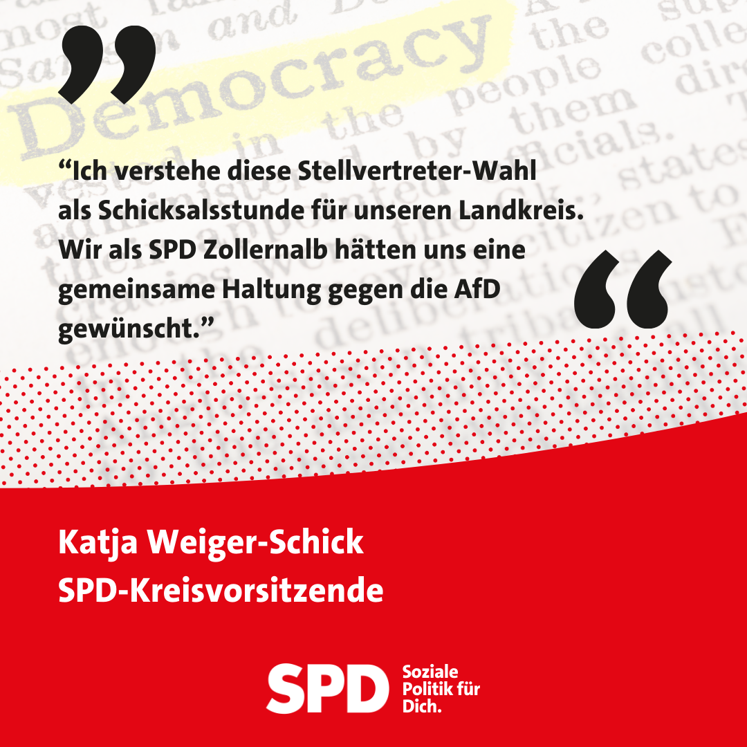 Es sei nur wenige Tage her, dass die SPD Zollernalb bei ihrer Kreismitgliederversammlung über diese Brandmauer zur AfD im Zollernalbkreis debattiert habe, betont Katja Weiger-Schick. Dass diese Diskussion eine derart kurze Halbwertszeit habe, sei für den SPD-Kreisvorstand entsetzlich: „Ich verstehe diese Stellvertreter-Wahl als historische Schicksalsstunde für unseren Landkreis. Wir als SPD Zollernalb stehen für eine offene, bunte Gesellschaft ohne Hass, Hetze, Ausgrenzung und Diskriminierung.“
