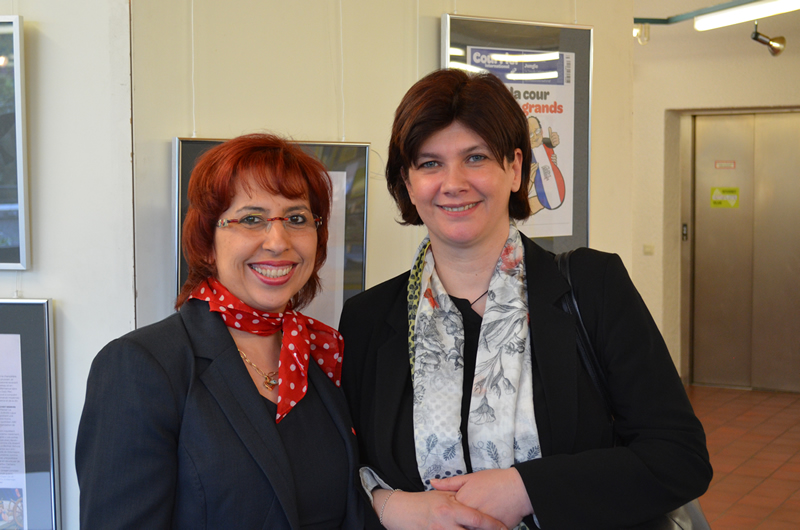 Stella Kirgiane-Efremidis mit der Bürgermeisterin der Albstädter Partnerstadt Chambéry, Bernadette Laclais. 50 Jahre Élysée Vertrag war der Anlass zur Feier der Französisch-Deutschen Beziehungen im Rahmen einer Veranstaltung des Arbeitskreis Chambéry in Albstadt-Ebingen. Dieser hatte sich erfolgreich bemüht, die renommierte Ausstellung von Prof. Dr. Ursula Koch aus München über „Marianne und Germania in der Karikatur“ nach Albstadt zu bekommen.