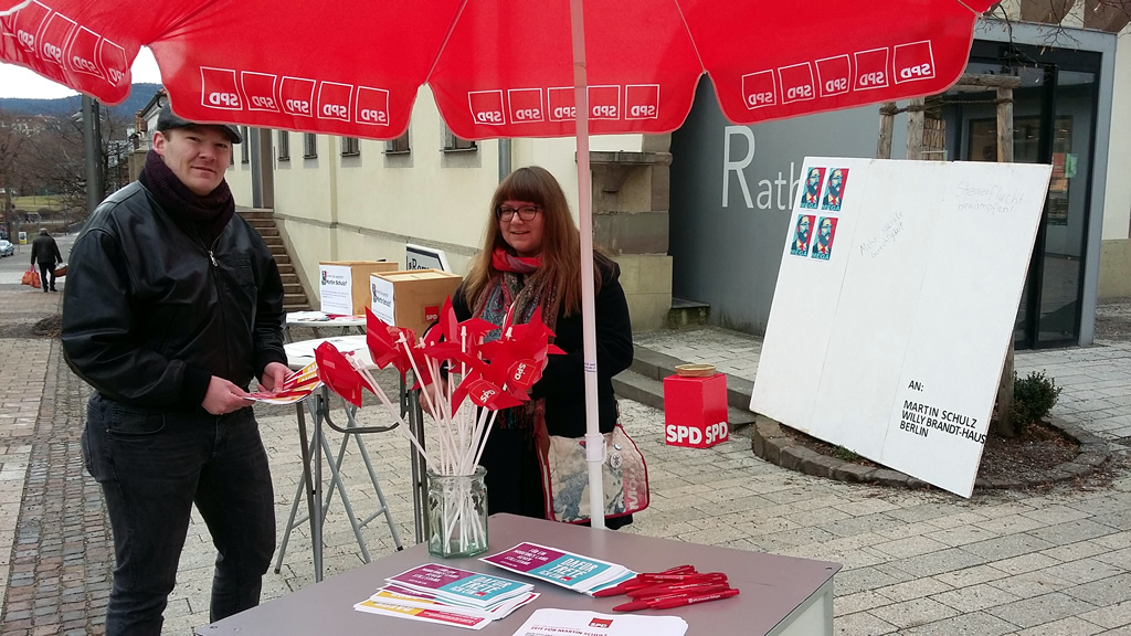 Diese Stimmung freut auch die SPD-Bundestagskandidatin Stella Kirgiane-Efremidis, die an diesem Vormittag viele Hände schütteln durfte und gleichfalls gerne Auskunft über den SPD-Kanzlerkandidaten Martin Schulz gab. Sollte die SPD-Politikerin einen guten Listenplatz beim anstehenden Landesparteitag der SPD Baden-Württemberg am 11. März erhalten, wofür nach parteiinternen Aussagen einiges spricht, und sollte die politisch gute Stimmung für die SPD bis zum Wahltag anhalten, könnte für die SPD im Zollernalbkreis der Traum auf ein Bundestagsmandat im Wahlkreis Zollernalb-Sigmaringen, erstmalig seit 1994, endlich wieder in Erfüllung gehen. Schon 2013 war es für Kirgiane-Efremidis denkbar knapp; nur 0,8% fehlten der SPD-Politikerin am Ende für den Einzug in den Bundestag.