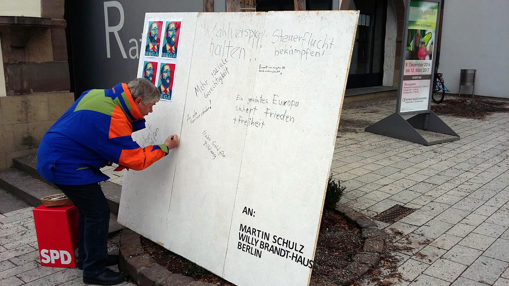 Auf einer überdimensionalen hölzernen Postkarte, adressiert an Martin Schulz im Willy Brandt-Haus, notierten viele Balinger Bürgerinnen und Bürger ihre Anregungen und Wünsche an den SPD-Kanzlerkandidaten. Und auch beim Martin Schulz-Quiz beteiligten sich zahlreiche Bürger – immerhin gab es handsignierte Bücher von Martin Schulz zu gewinnen. Das Ergebnis war also eindeutig: „Auch in Balingen genießt Martin Schulz große Sympathien und scheint bei den Menschen gut anzukommen“, bewertet der SPD-Kreisvorsitzende die positiven Rückmeldungen der Bürger und deren großes Interesse an Martin Schulz. „Viele Menschen verbinden mit ihm große Hoffnungen auf einen Politikwechsel in unserem Land“, weiß Alexander Maute die gegenwärtige Stimmung auch im Zollernalbkreis zu bewerten. Dies belegt auch die Zunahme an Parteieintritten im Zollernalbkreis in den zurückliegenden zwei Wochen.