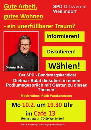Diese Themen bewegen die Menschen. „Wie geht es mit unserer Wirtschaft weiter? Wie schaffen wir mehr Wohnraum in Ballungsgebieten? „ Bei einer Podiumsdiskussion am Mo 10.2. um 19.30 Uhr im Cafe 13 (Rennstraße 3) haben Sie die Gelegenheit die Meinung unseres SPD Bundestagskandidaten Dietmar Bulat zu hören und ihre Fragen zu stellen.