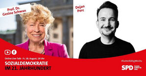 Unter dem Motto „Sozialdemokratie im 21. Jahrhundert“ hat Dejan Perc, SPD-Bundestagskandidat im Wahlkreis Stuttgart II und SPD-Kreisvorsitzender, gemeinsam mit Prof. Dr. Gesine Schwan, Vorsitzende der Grundwertekommission der SPD, diskutiert. Die Veranstaltung kann auf Facebook und dem YouTube-Kanal von Dejan Perc in voller Länge gestreamt werden.