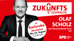 Olaf Scholz kommt am Montag ab 17:30 Uhr auf den Marktplatz nach Karlsruhe! Kommt vorbei oder schaut euch die Veranstaltung hier im Live-Stream an.