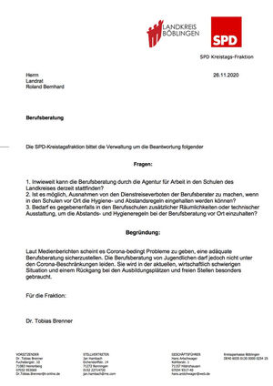 Die Kreistags-SPD will von der Landkreisverwaltung wissen, inwiefern die Berufsberatung an den Schulen des Landkreises trotz den Corona-Beschränken stattfinden kann. Ausgangspunkt sind Medienberichte dieser Woche in denen Schulen kritisieren, dass die Berufsberater der Agentur für Arbeit Dienstreiseverbote hätten und keine ordentliche Berufsberatung stattfinden könne.