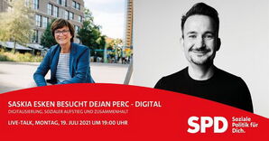 Die SPD-Parteivorsitzende Saskia Esken trifft den Stuttgarter Bundestagskandidaten Dejan Perc und diskutiert mit ihm über die Themen, die beide Politiker*innen inhaltlich verbindet: Digitalisierung, sozialer Aufstieg und Zusammenhalt. Auch die Teilnehmer*innen der Online-Veranstaltung haben die Gelegenheit, ihre Fragen an Saskia Esken zu richten. Es darf alles gefragt werden, was die Menschen in Stuttgart und der Region derzeit umtreibt.