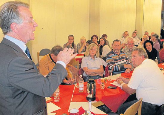 Foto: Hardy Kromer Er weiß wovon er spricht und man nimmt ihm ab, worüber er spricht: Franz Müntefering MdB, ehemaliger SPD-Bundesvorsitzender kam auf Einladung des SPD-Ortsvereins Bisingen in die Hohenzollernhalle um über den demografischen Wandel zu referieren. Sein Botschaft: "Man kann die Dinge beeinflussen. Soziale Gerechtigkeit und Zukunftschancen für alle müssen möglich gemacht werden."